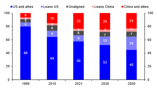In contrast, the impact on productivity growth in China and some of its allies will be substantial. The wider reach of the US-led bloc, and the broader networks within in, will help it to adapt to the challenges posed by fracturing. In contrast, the China-led bloc is dominated by China itself, making adaption harder and therefore increasing the potential economic hit. This is embedded in our view that China’s growth rate will slow to 2% by the end of this decade.