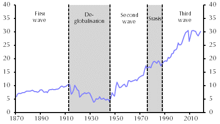 In some respects, the period of globalisation that fundamentally reshaped the world economy during the 1990s and 2000s was nothing new. In fact, the world has experienced three waves of globalisation over the past 150 years. The first ran from 1870 to 1914. During this period, a combination of tariff reduction and new technologies (in particular the growing use of steam-powered ships) led to a surge in global trade. In the four decades from 1870, global goods exports rose from 5% to 10% of world GDP. (See Chart 1.)