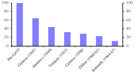 | Chart 2: Weighted Average US Tariff Rates After GATT Rounds (Pre-GATT = 100) |