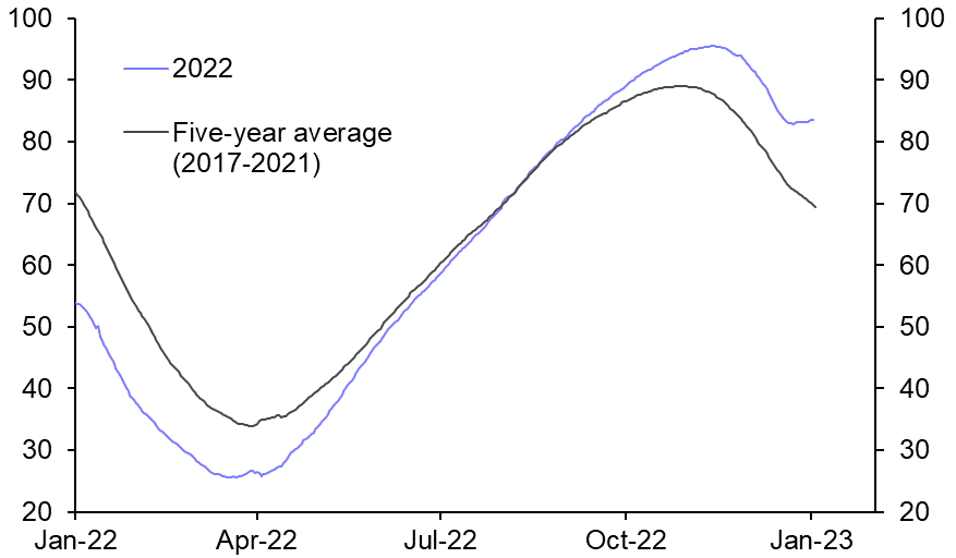 The first relates to China’s reopening. Julian Evans-Pritchard provides a useful summary here, but the short version is that the rapid dismantling of COVID restrictions has led to a surge in infections that is producing large negative shocks to both supply and demand. The hit to output in the coming months will be substantial but, as Julian argues, fears that reopening will push up inflation in China and the rest of the world may prove misplaced.