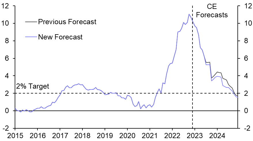 We had expected gas prices to fall back this year, but the scale and speed of the move has been far greater than we had envisaged. Lower natural gas prices will help the fight against inflation in Europe, but the impact on CPI might be smaller than one might have expected given the drop in wholesale prices. We’ve pulled down our forecast for European gas prices to reflect recent moves, but in the case of the UK that means inflation over the second half of this year will be only 0.3%-pts lower than we had anticipated, while inflation in 2024 will be about 0.5%-pts lower. That’s helpful, but looks small when set against current double-digit rates of inflation and the fact that base effects were always likely to pull down headline CPI this year. (See Chart 2.)