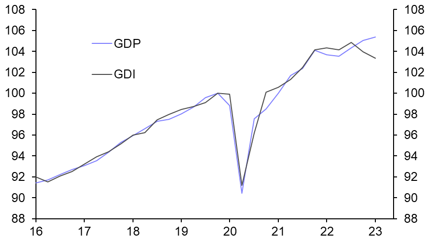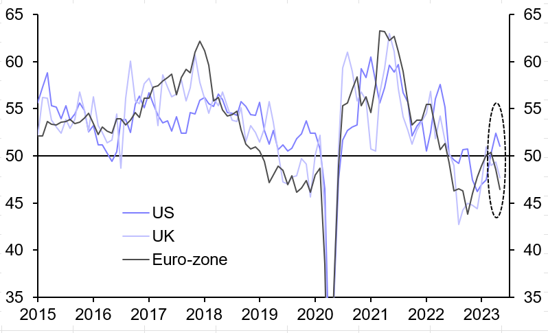 At the same time, while unemployment in Europe is extremely low by regional standards, households are suffering a huge squeeze in real incomes. As a result, while the euro-zone has experienced the mildest of recessions so far (GDP fell by 0.1% q/q in the fourth quarter of last year and first quarter of 2023), consumer spending has declined by 1.3% over the past two quarters. Look under the hood and economies suddenly look less resilient.