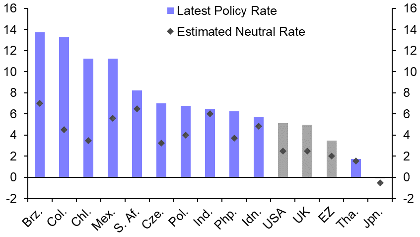 As a result, interest rates in major emerging economies peaked at well above our estimates of their “neutral” level. (See Chart 2.) Interest rates in major advanced economies are also now above our estimates of their neutral level, but they have taken longer to get there and the gap between the current level of rates and their “neutral” level is smaller.