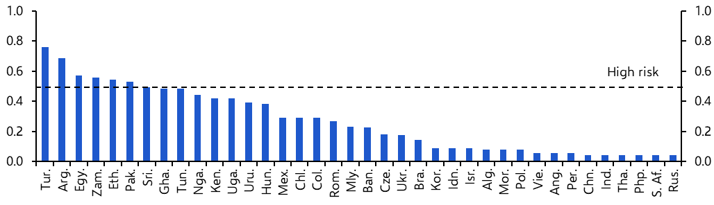 The move in the dollar so far has not been large or fast enough to cause broader financial dislocation: as noted earlier, while it is close to its highest levels in trade-weighted terms since the signing of a joint agreement to weaken the currency at the Plaza Hotel in 1985, the dollar is up by only 3% this year, moving steadily rather than abruptly higher. A strong dollar is a concern for emerging economies with large external vulnerabilities. Our proprietary EM Financial Risk Indicators suggest that currency risks are high in Turkey, Argentina and some frontier markets but relatively contained elsewhere. (See Chart 5.) A string of currency crises looks unlikely. (We’ll be publishing the next edition of our EM Financial Risk Indicators on Tuesday. Stay tuned.)