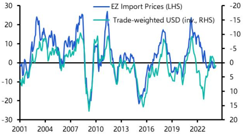 Chart 3: Trade-Weighted Dollar and Euro-zone Import Prices (% y/y)
