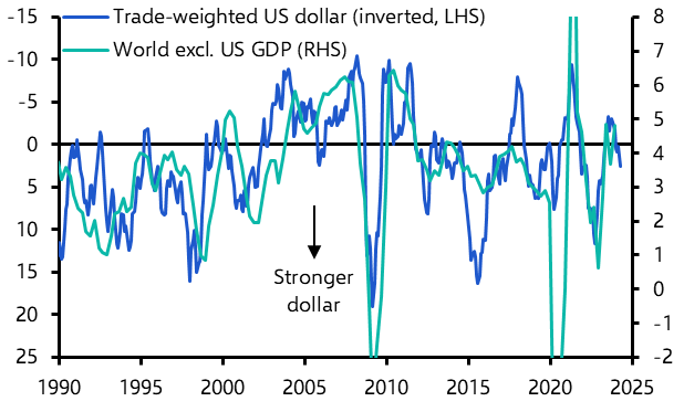 Similarly, while there are several reasons why a strong dollar might harm global trade and activity more generally, these are often overwhelmed by other factors in practice. There is a reasonable relationship between moves in the dollar and changes in world GDP, excluding the US. But this is principally because weaker economic growth leads to a rise in risk aversion in markets which pushes up the dollar. (See Chart 4.) In other words, the causation runs from the global economy to the dollar rather than the other way around. In the long run, arguably the biggest risk is that a strong dollar exacerbates global trade imbalances by weighing on US competitiveness and adding to pressure on its current account.